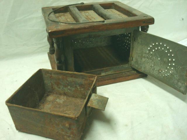Title (ebay affiliate link): Antique Oak Wood & Punched Tin Foot Warmer,Primitive, Country. No Reserve