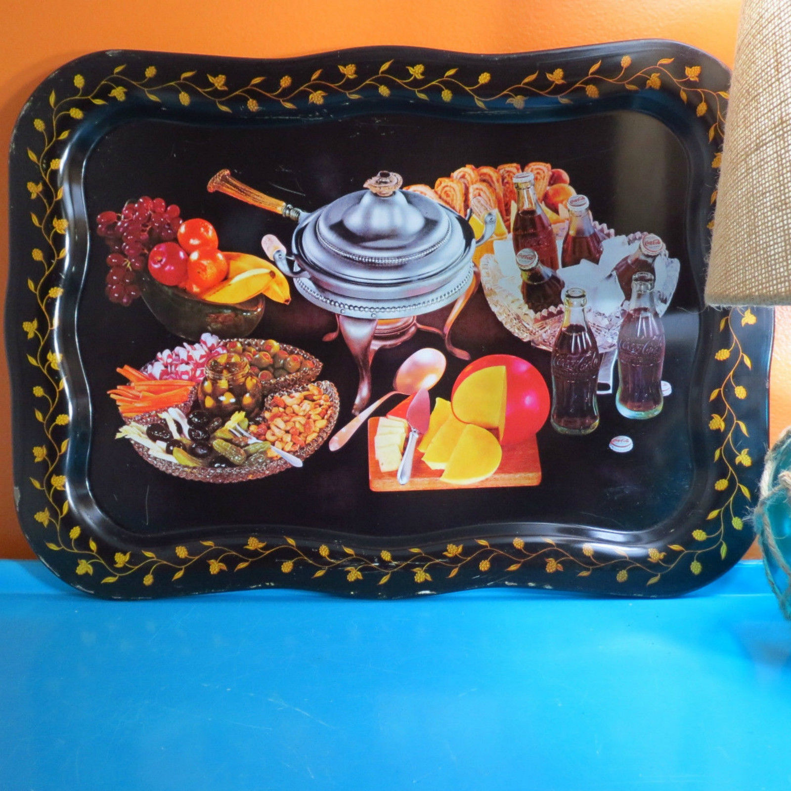 Title (ebay affiliate link): VTG 1970s Retro Coke Coca Cola Fondue Cheese Party Black Metal TV Serving Tray