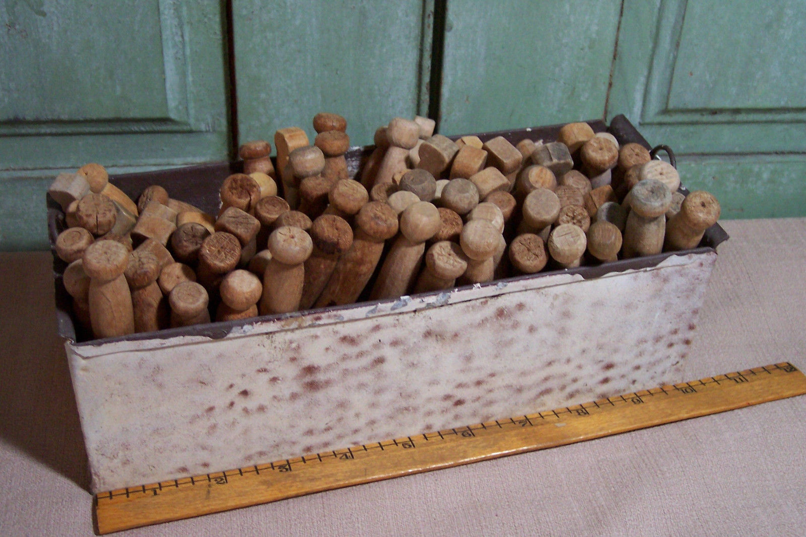 vintage primitive tin metal basket wooden wood clothespins laundry decor