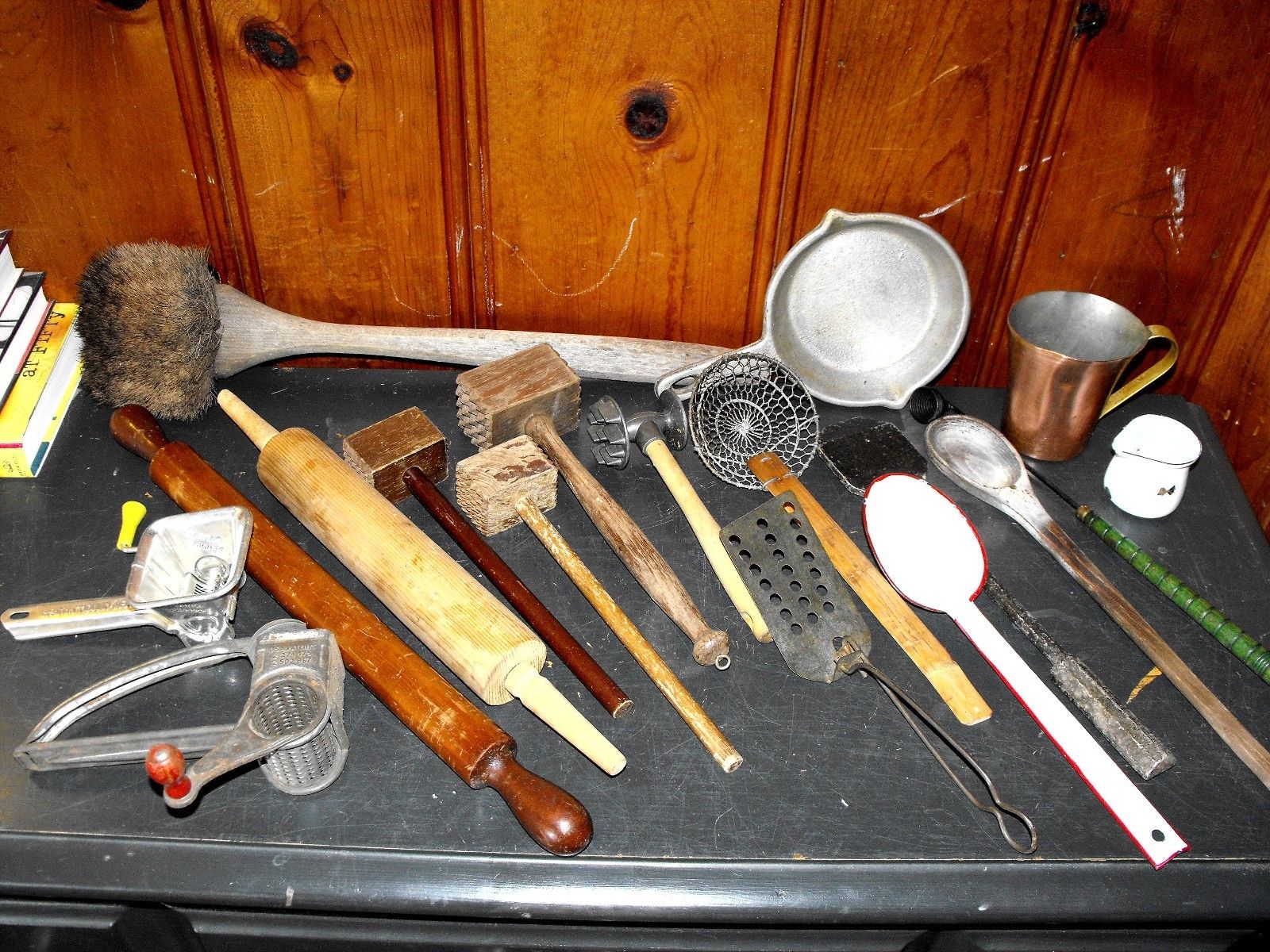 Title (ebay affiliate link): Primitive Antique Kitchen Utensils Lot of 18 COPPER CUP ROLLING PINS STRAINER