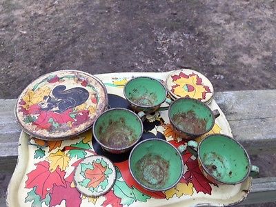 Vintage 1939 Ohio Art Tin Lithograph Child''s Toy Tea Set "Squirrels"