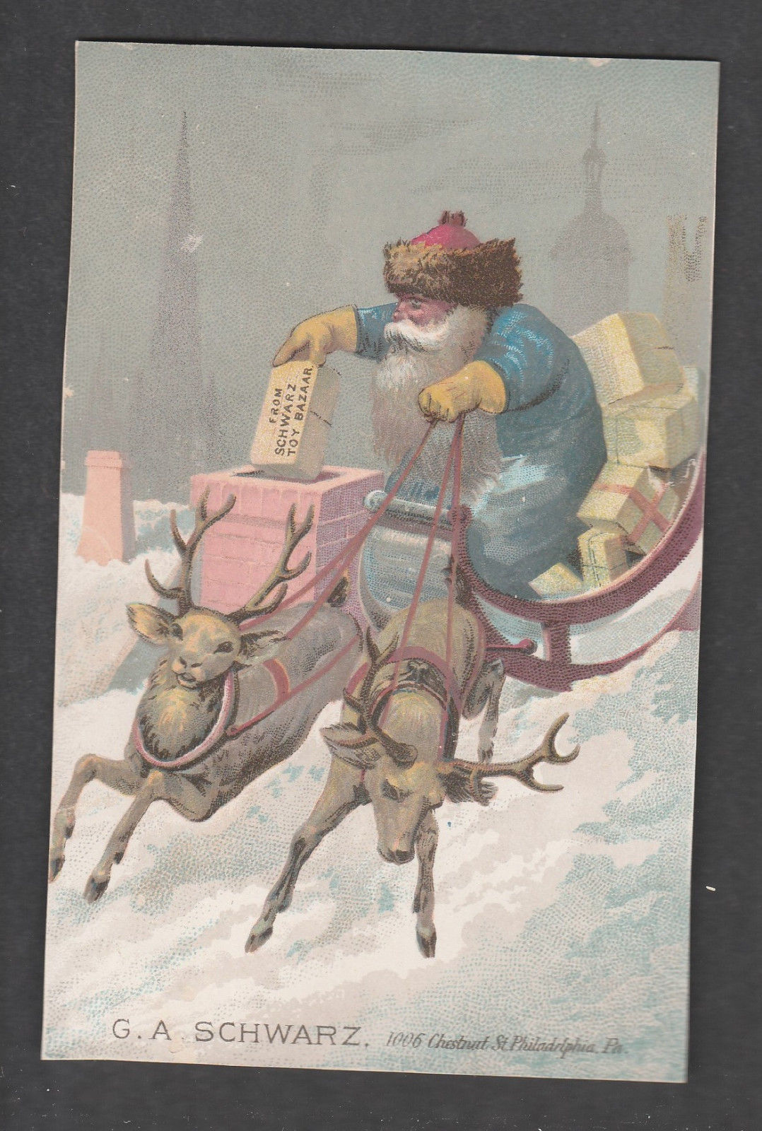 VICTORIAN TRADE CARD BLUE SUIT SANTA G.A. SCHWARZ CHRISTMAS INVITATION