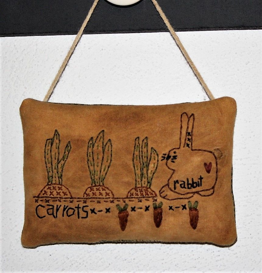 Title (ebay affiliate link): Primitive Stitchery Pillow/Ornament ~ Rabbit in Carrot Garden ~ Spring/Easter