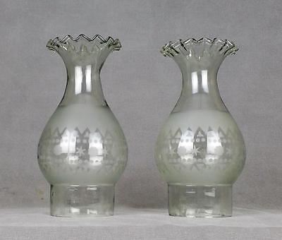 *Pair* Victorian Queen Anne Etched Glass Kerosene Oil Lamp Lotus Chimney Shade