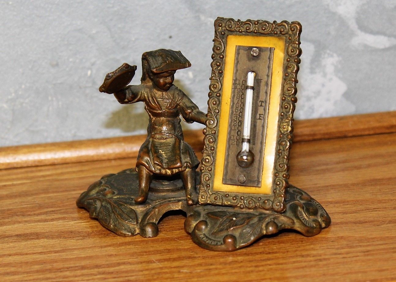 RARE! Antique Bronze girl Figural Desk Thermometer vintage like napkin rings