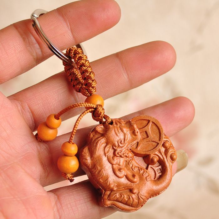 China wood Carving Fengshui Fu Foo Dog Lion statue key chain Praying Pendant K05