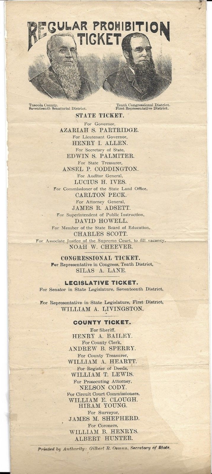 Title (ebay affiliate link): AZARIAH PARTRIDGE GOVERNOR, RARE PROHIBITION PARTY TUSCOLA CO. MICHIGAN BALLOT