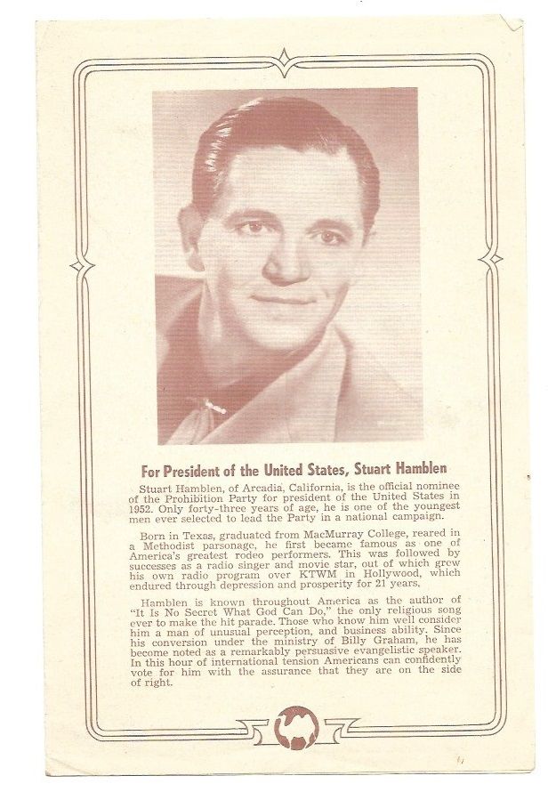 Title (ebay affiliate link): STUART HAMBLIN, E.A. HOLTWICK PROHIBITION PARTY 1952 CAMPAIGN FLYER