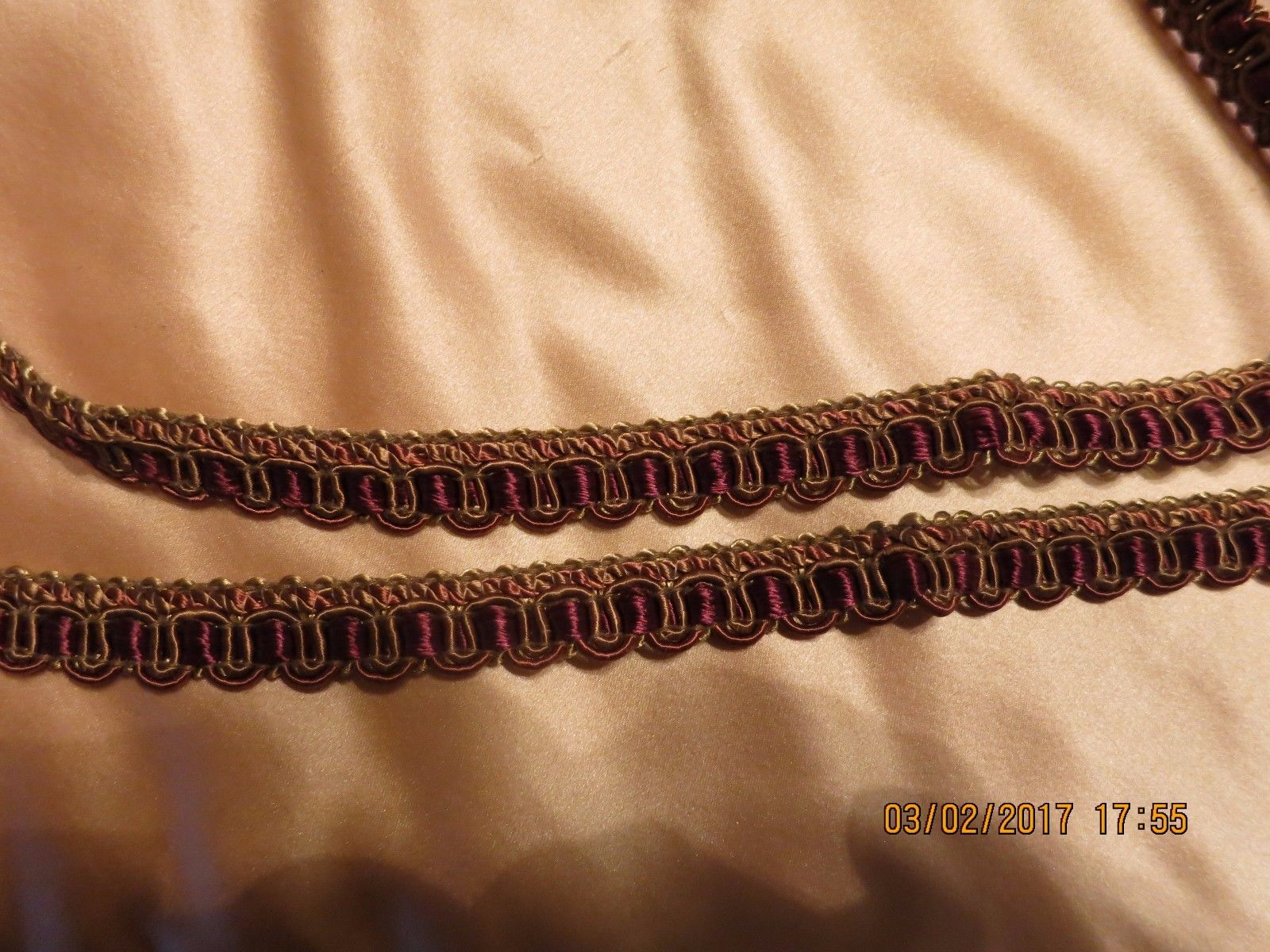 Title (ebay affiliate link): AWESOME TRIM WINE SILKY THREAD GOLD LOOPS DOLLS SHADE QUILT - 130" L