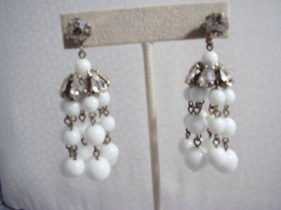 Shoulder Duster Milk Glass Bead & Rhinestone Earrings