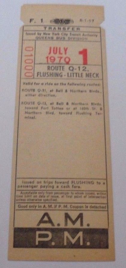 Title (ebay affiliate link): 1970 NYC TRANSIT AUTHORITY Q12 BUS LINE FLUSHING LITTLE NECK TRANSFER #1000