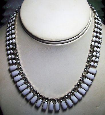 Superb Milk Glass Cabochon Vintage Rhinestone Necklace