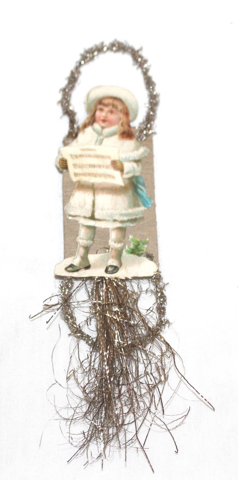 Title (ebay affiliate link): Miniature Victorian Girl, Caroling. Early 1900s Tinsel & Paper Ornament. German