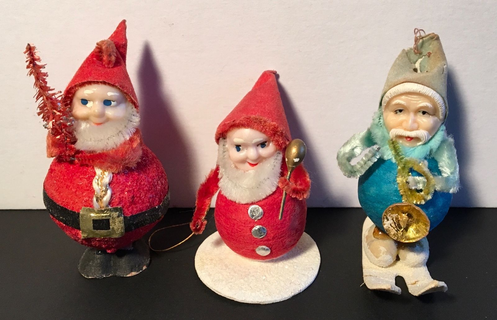 Title (ebay affiliate link): 3 Vtg Japan Christmas Decor Santa:Spun Cotton/Chenille, Red w/ Tree, Blue w/Skis