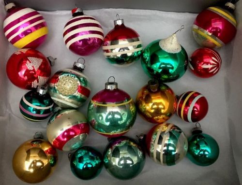 Title (ebay affiliate link): Vintage Shiny Brite Mica Stencil Striped Christmas Ornaments Lot Of 18
