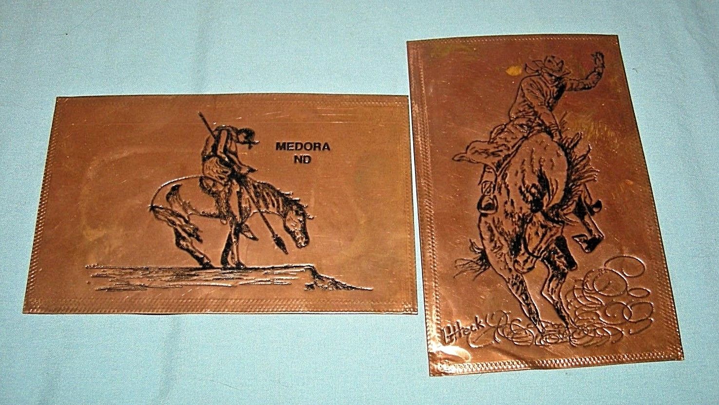 Title (ebay affiliate link): 2 Vintage Copper Postcards Bucking Bronco Medora ND