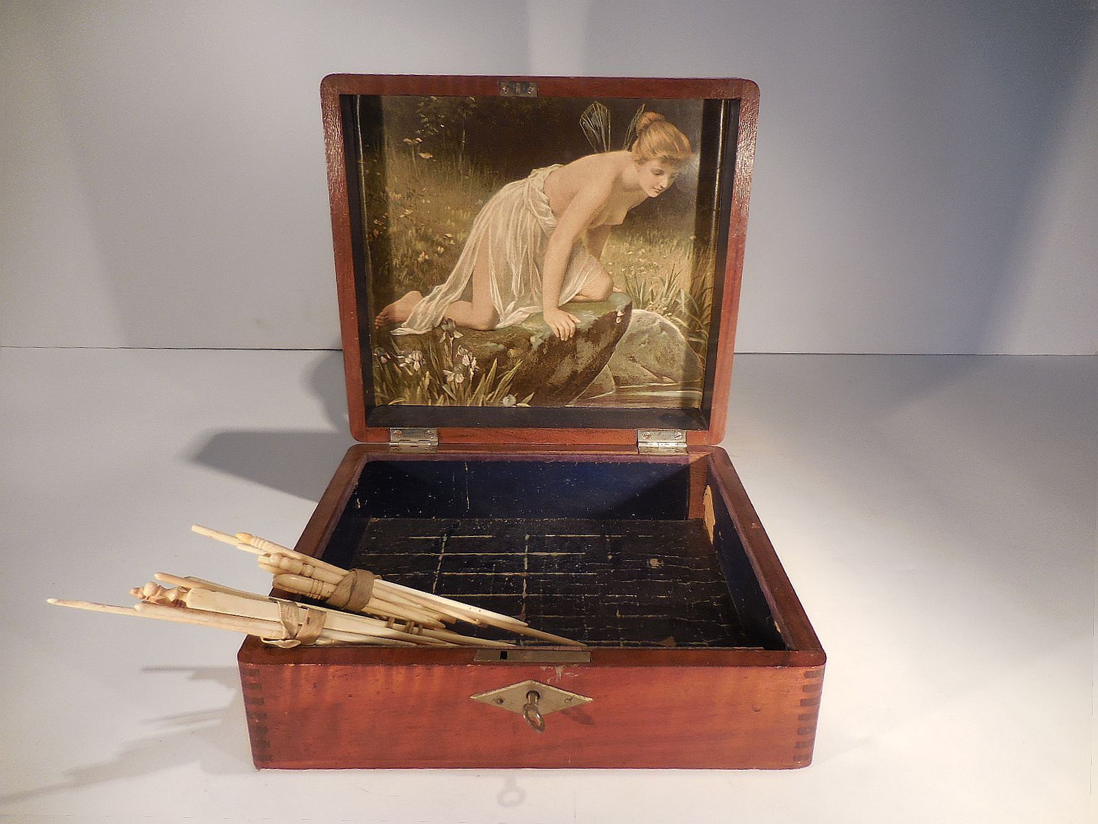 AAFA Mahogany Dovetail Box Lithograph White Rock Girl Bone Sewing Needles