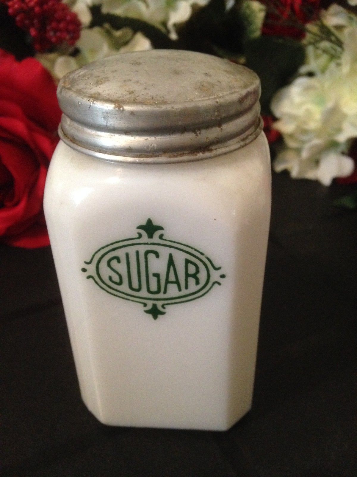 Title (ebay affiliate link): VINTAGE HAZEL ATLAS MILK GLASS WHITE SUGAR SHAKER WITH LID GREEN SHIELD LETTERS
