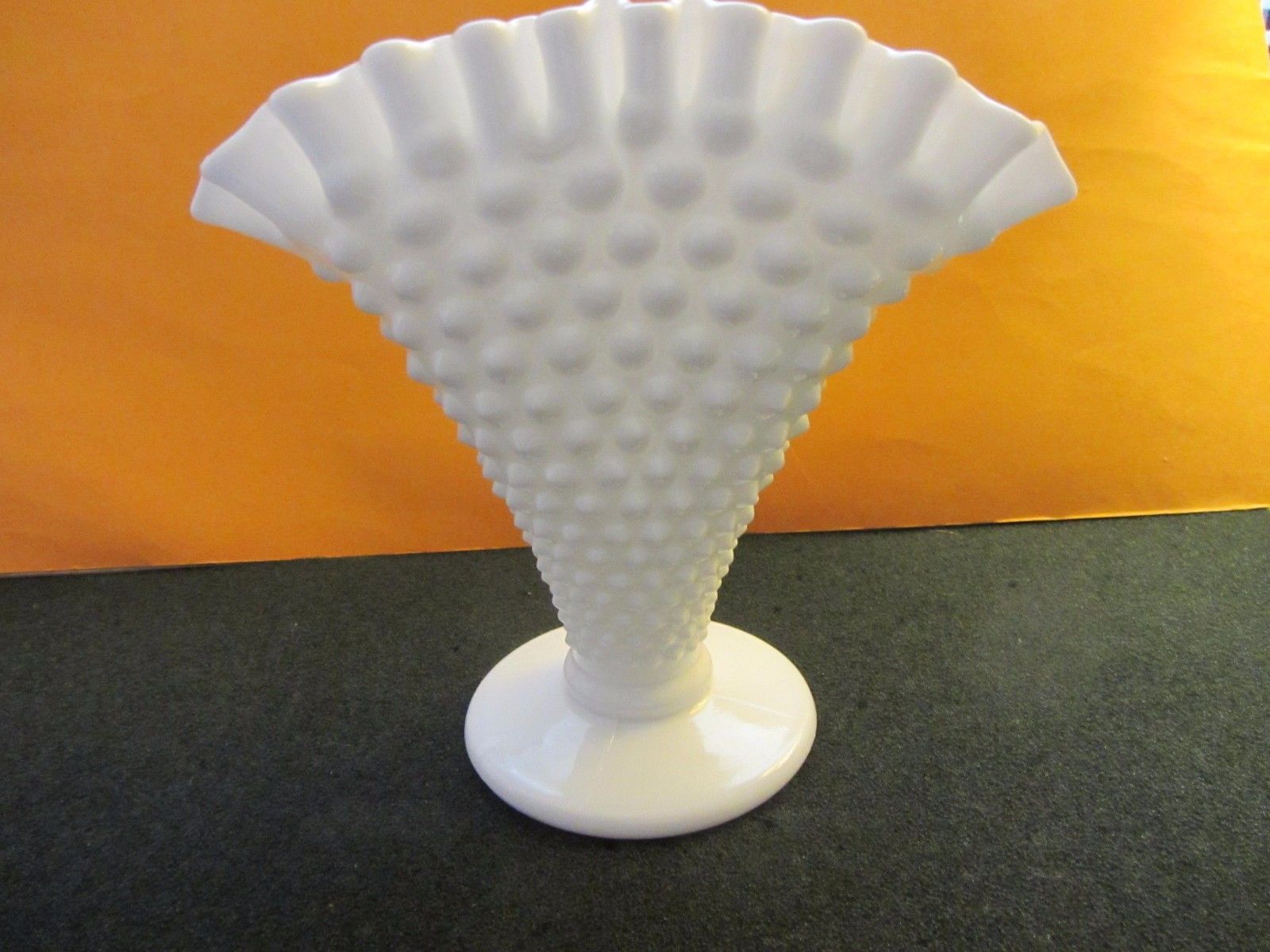 Title (ebay affiliate link): 6 inch footed crimped edge fan shaped milk glass vase from Fenton