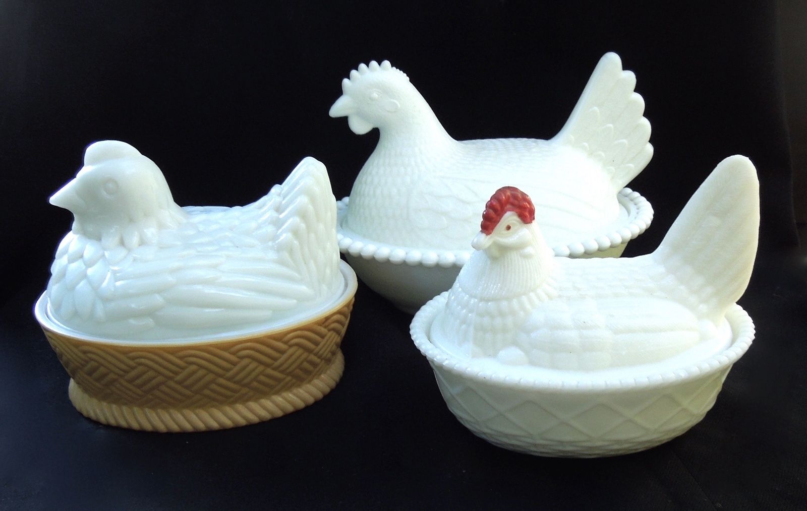 Title (ebay affiliate link): 3 VTG Milk glass Hen on basket/nest covered Egg/Candy Dish Lot Westmoreland/Avon