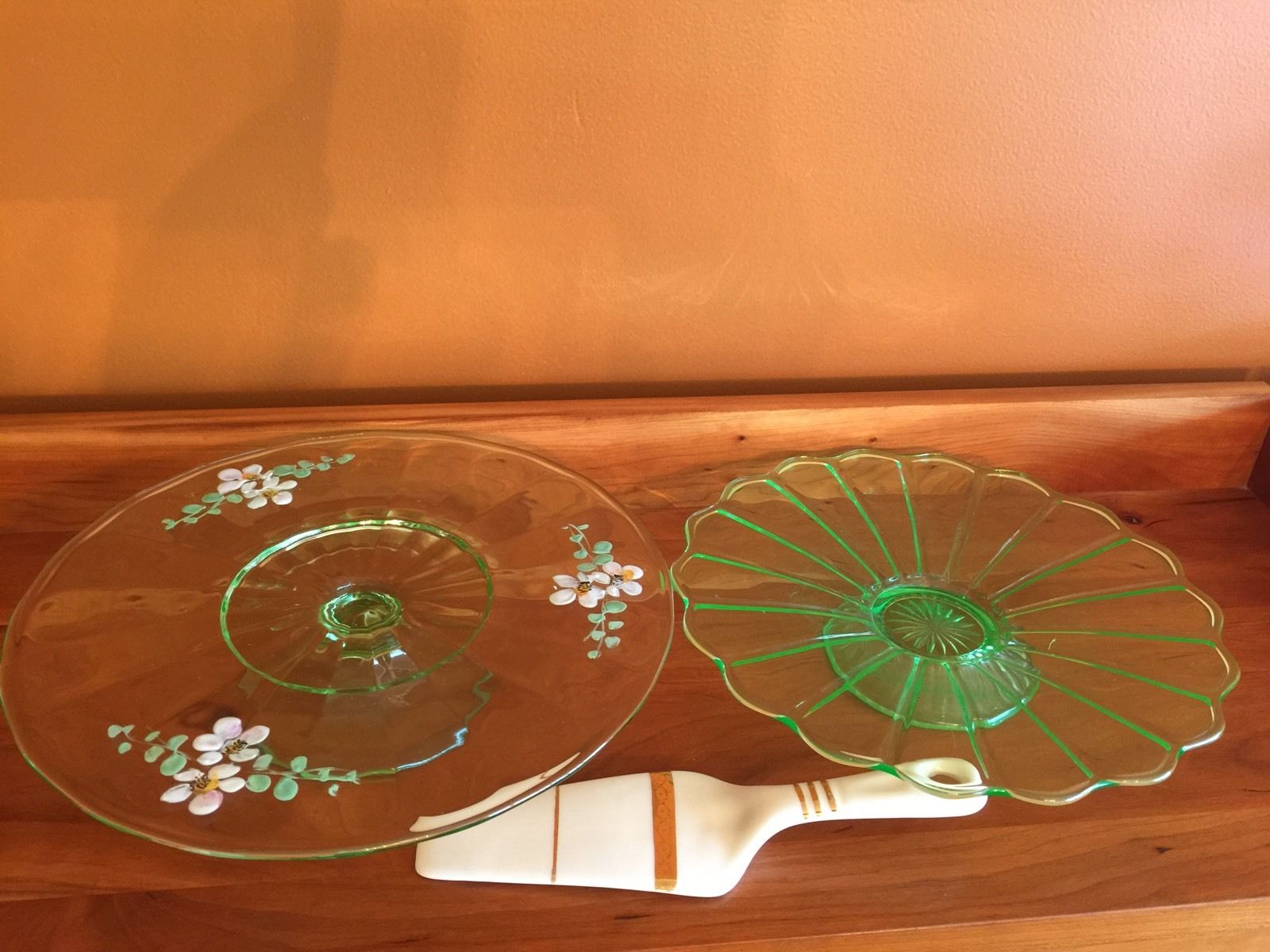Title (ebay affiliate link): Vintage Green Glass Footed Cake Plates (2) and Server
