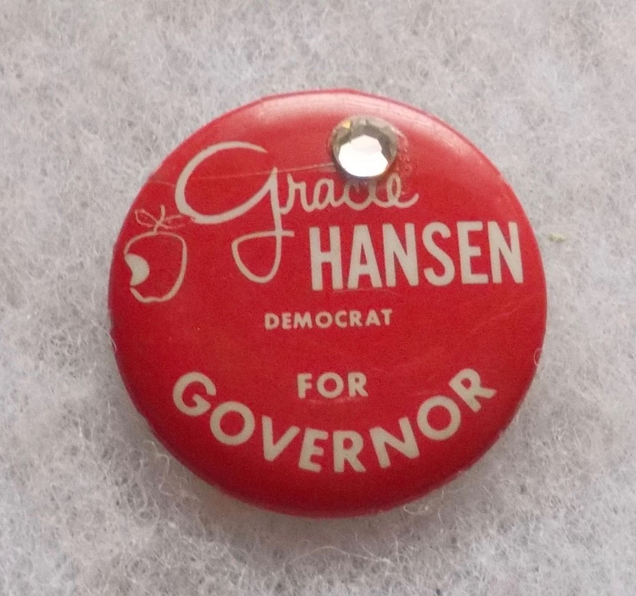 Title (ebay affiliate link): VINTAGE 1970 "GRACIE HANSEN DEMOCRAT FOR GOVERNOR (OR) BUTTON WITH FAKE DIAMOND