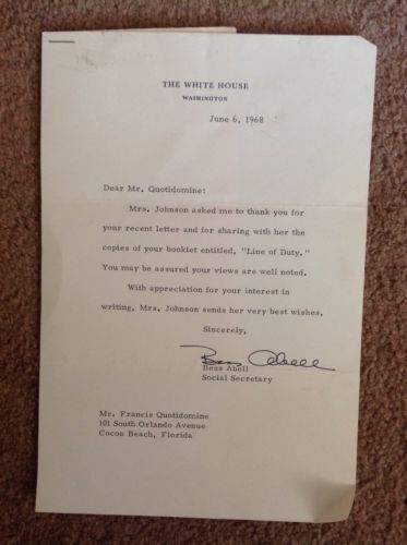 Title (ebay affiliate link): Letter From Bess Abell, Lady Bird Johnson''s Assistant, On White House Stationar