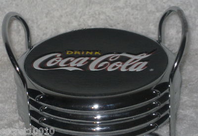 Title (ebay affiliate link): COCA COLA CHROME AND FAUX LEATHER COASTER SET