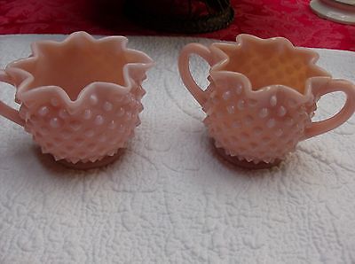 VINTAGE FENTON PINK Rose HOBNAIL CRIMPED MILK GLASS SUGAR AND CREAMER SET