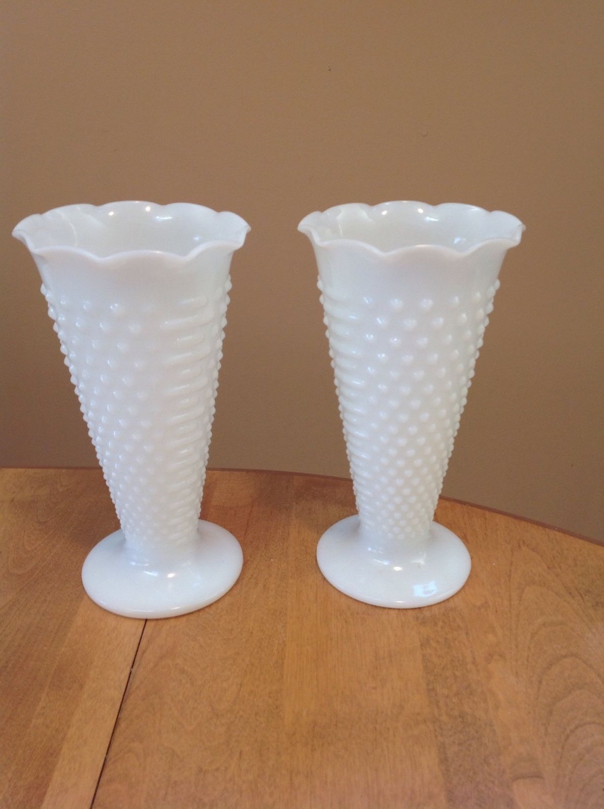 Title (ebay affiliate link): 2 Vintage White Milk Glass Ruffled Hobnail Trumpet Tall Vases