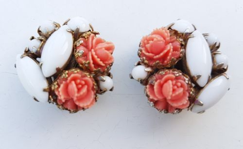 Title (ebay affiliate link): So pretty Vintage 1950''s White Milk Glass and Coral flower clip on Earrings