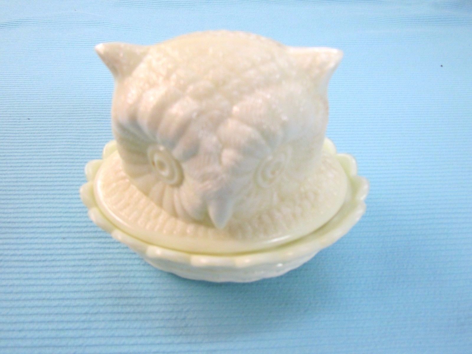 Title (ebay affiliate link): Vintage Westmoreland White Opaque Milk Glass Owl Head On Basket Covered Dish