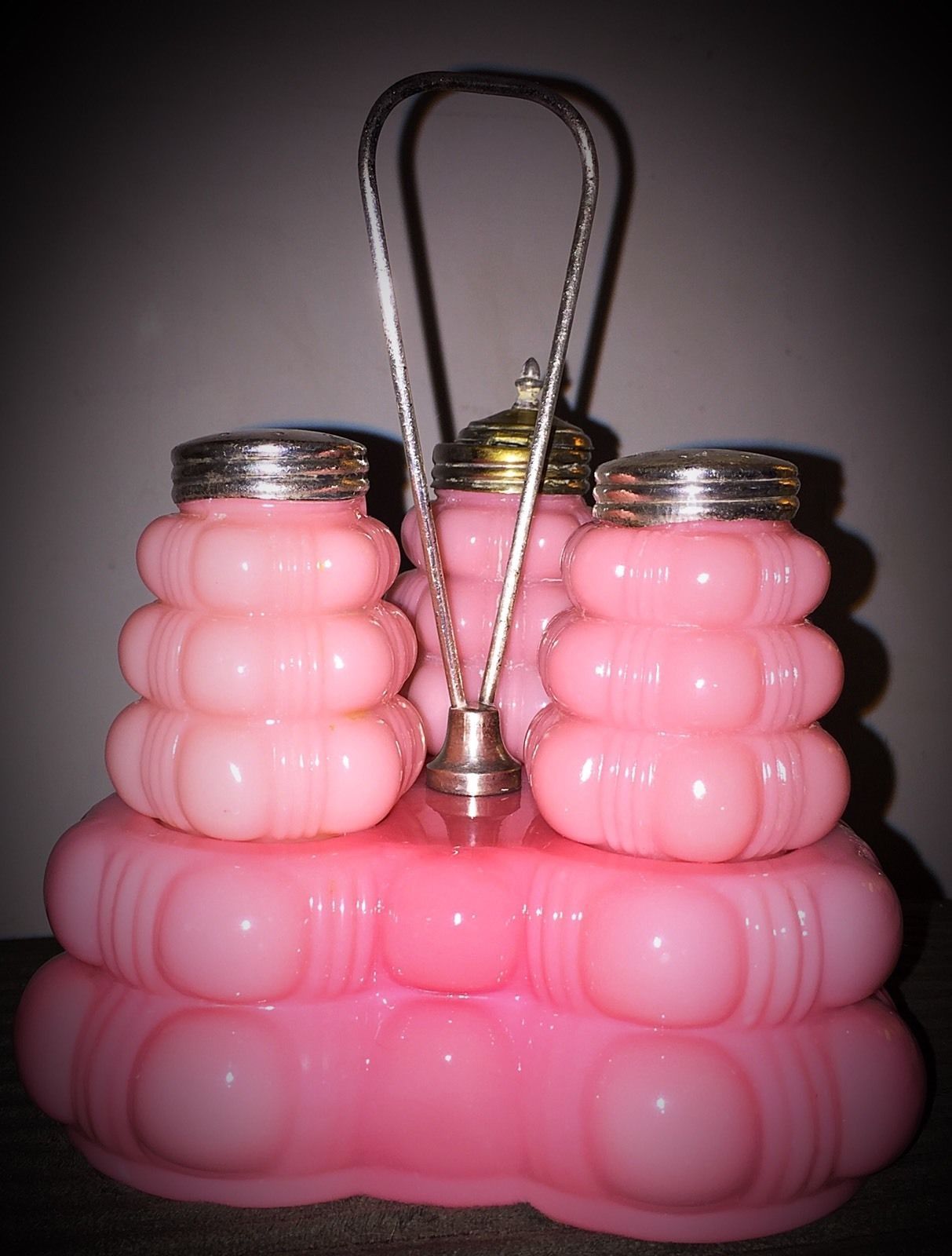 Title (ebay affiliate link): RARE ANTIQUE GLOSSY PINK MILK GLASS CONDIMENT SET, SALT / PEPPER