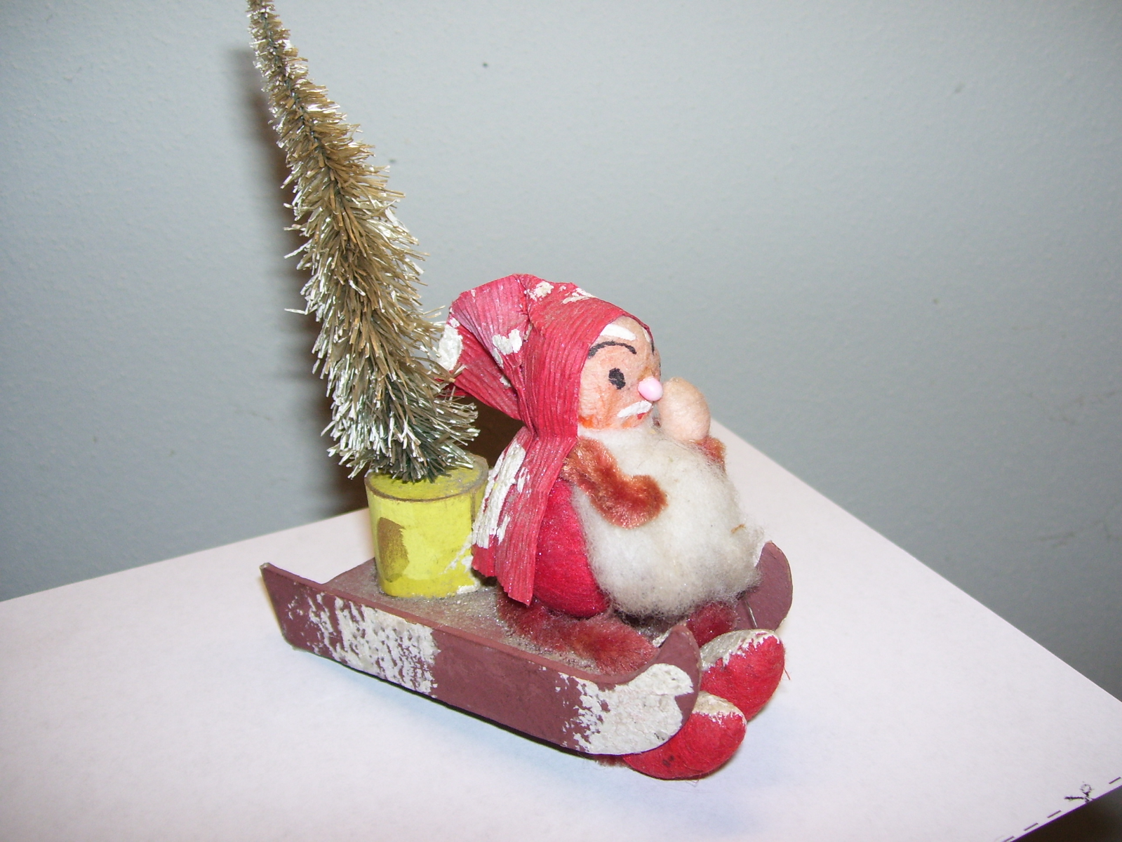 VTG JAPAN CHRISTMAS SANTA ON WOOD SLED BOTTLE BRUSH TREE SPUN COTTON FACE