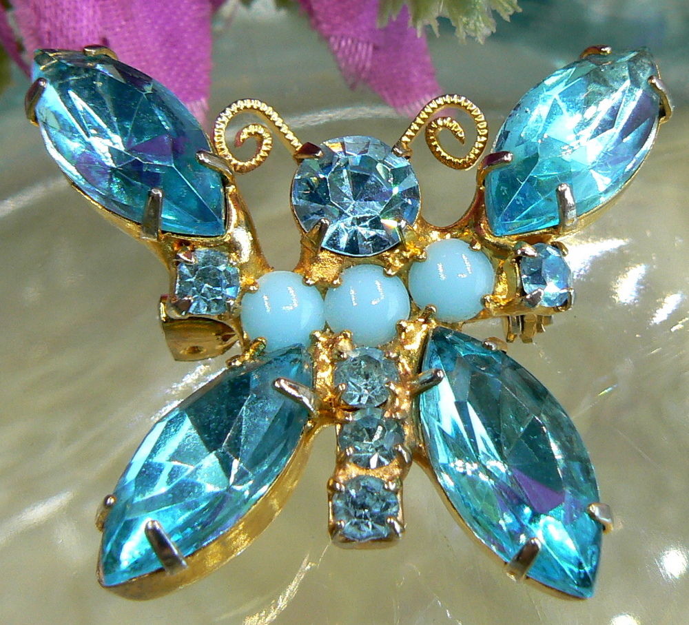 Title (ebay affiliate link): UNIQUE PRETTY VINTAGE AQUA BLUE RHINESTONE MILK GLASS BUTTERFLY PIN BROOCH NICE!
