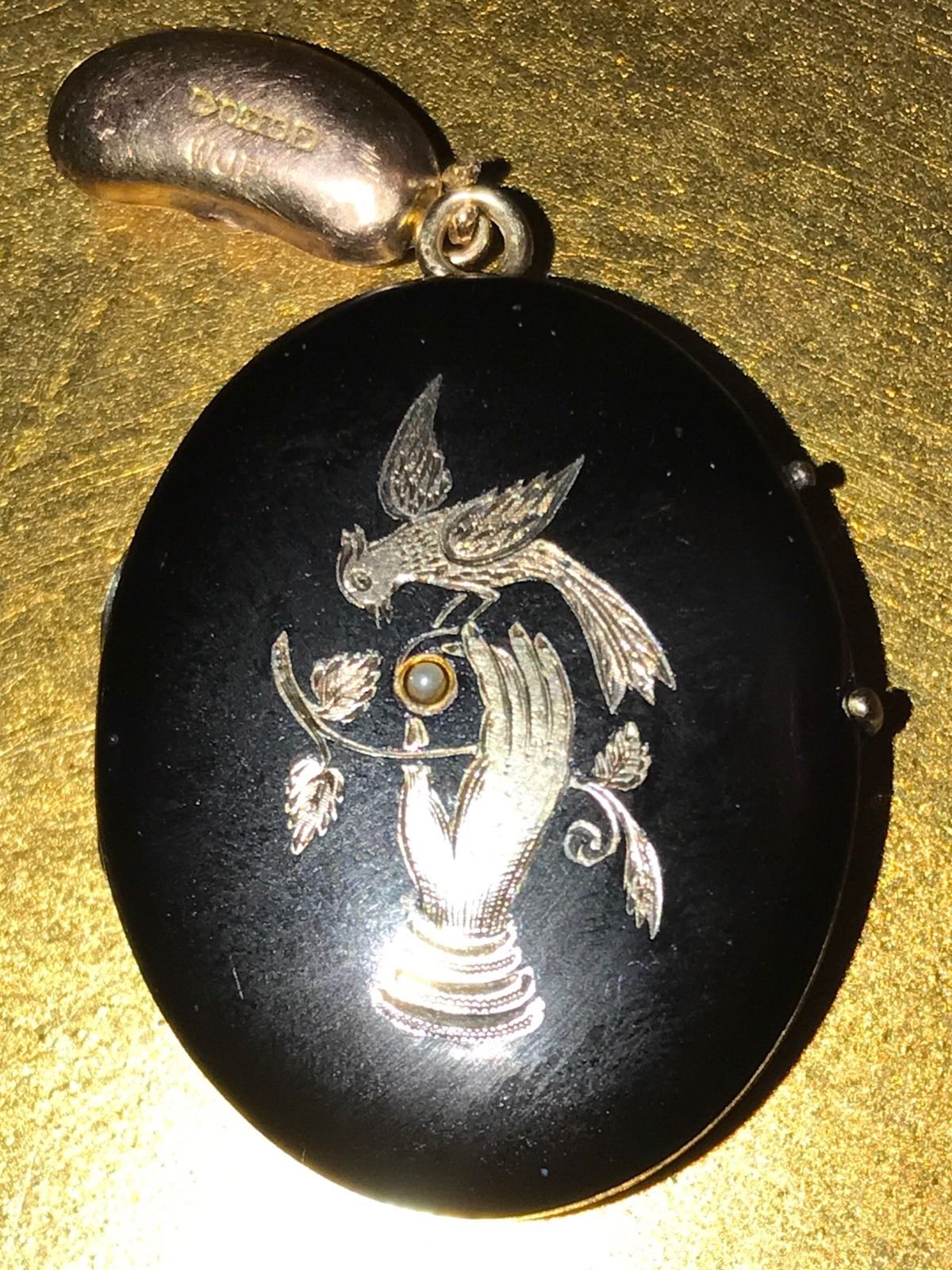 Title (ebay affiliate link): ANTIQUE EDWARDIAN MEMENTO MORI MOURNING FEDE HAND BIRD BEAN 9CT GOLD LOCKET UK