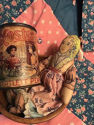 Title (ebay affiliate link): Primitive Decor Lot ~ Vintage ~ Wooden Herb Bowl~Hostess Tin Can Bank~Cloth Doll