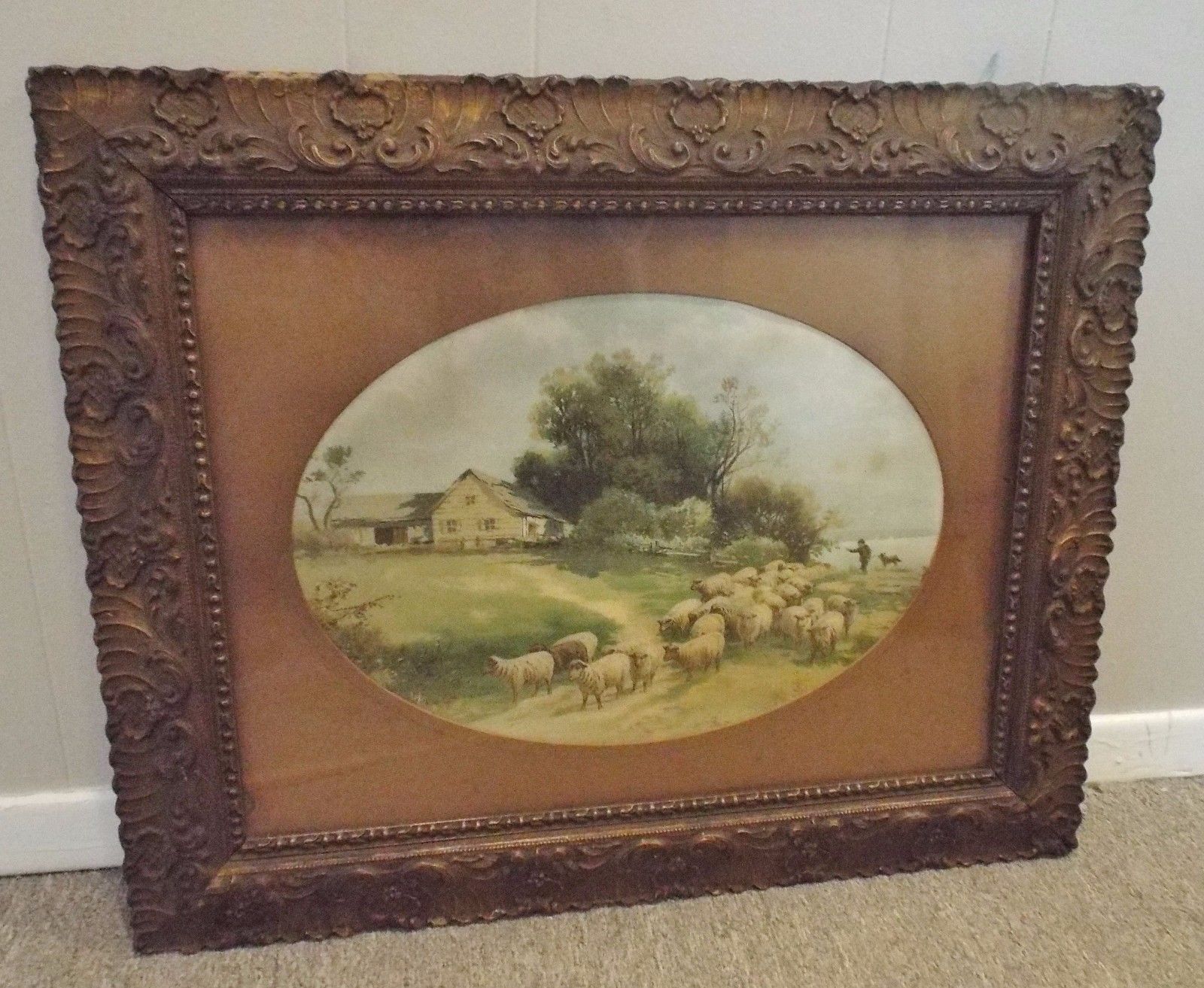 Title (ebay affiliate link): Vintage Ornate Wood Framed & Matted Early Print, Farm Sheep Landscape - NICE!
