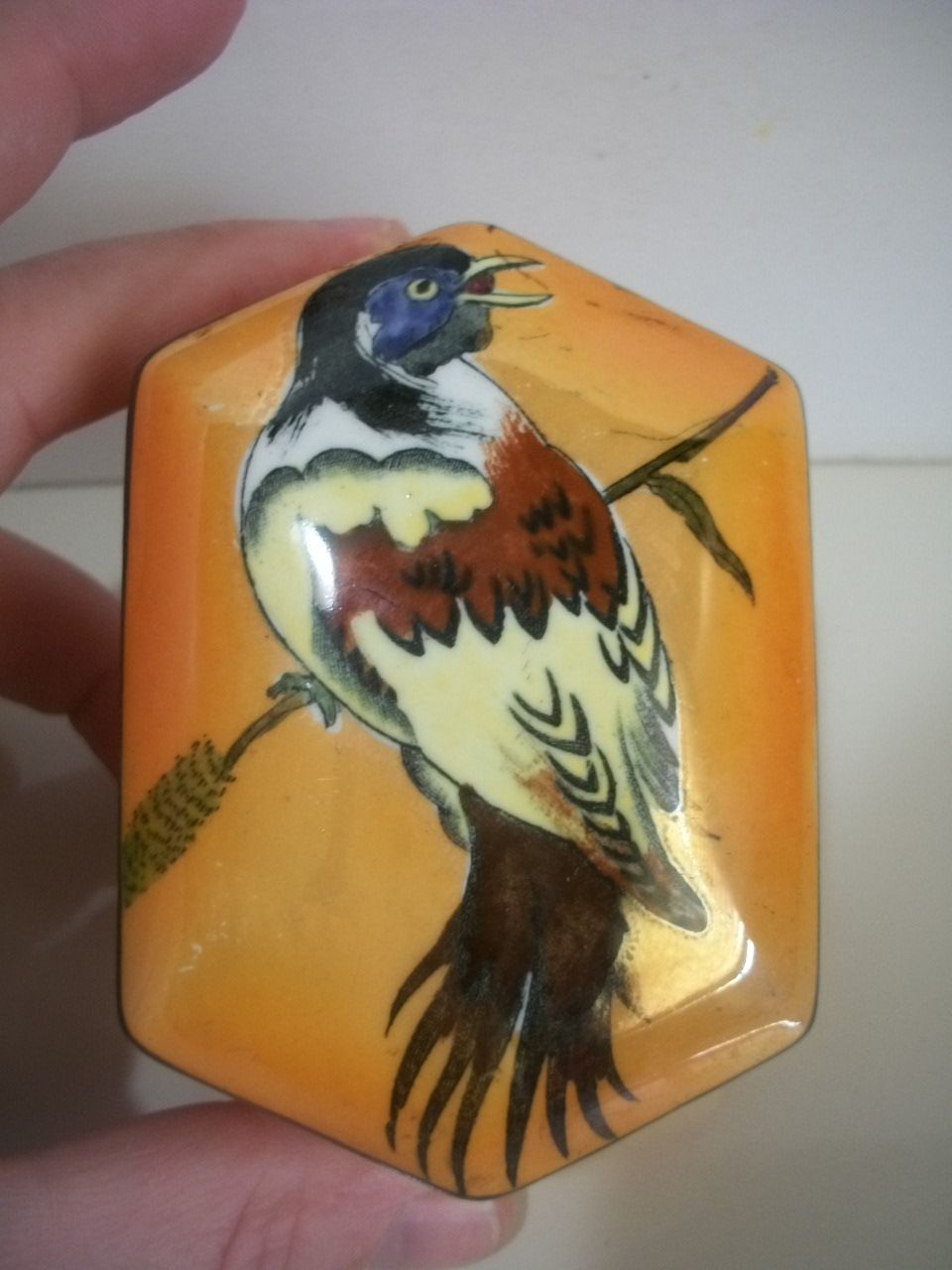 Title (ebay affiliate link): Antique Art Deco HP Porcelain Hexagon Bird Trinket Box Orange Iridescent