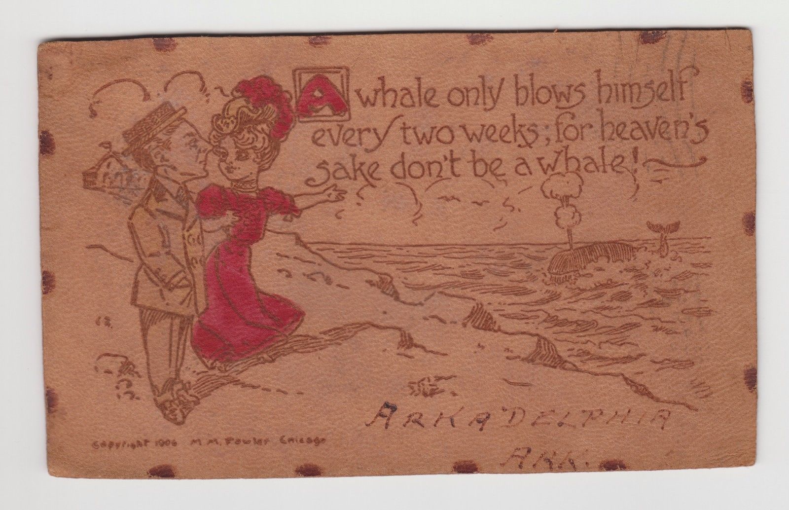 Title (ebay affiliate link): 1906 LEATHER MM Fowler POSTCARD "A Whale only blows himself every two weeks..."