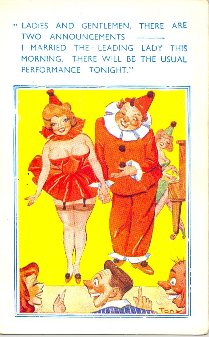 Title (ebay affiliate link): Comic Postcard: Stockings, Nylons, Suspenders, Theatre & Clown Humour