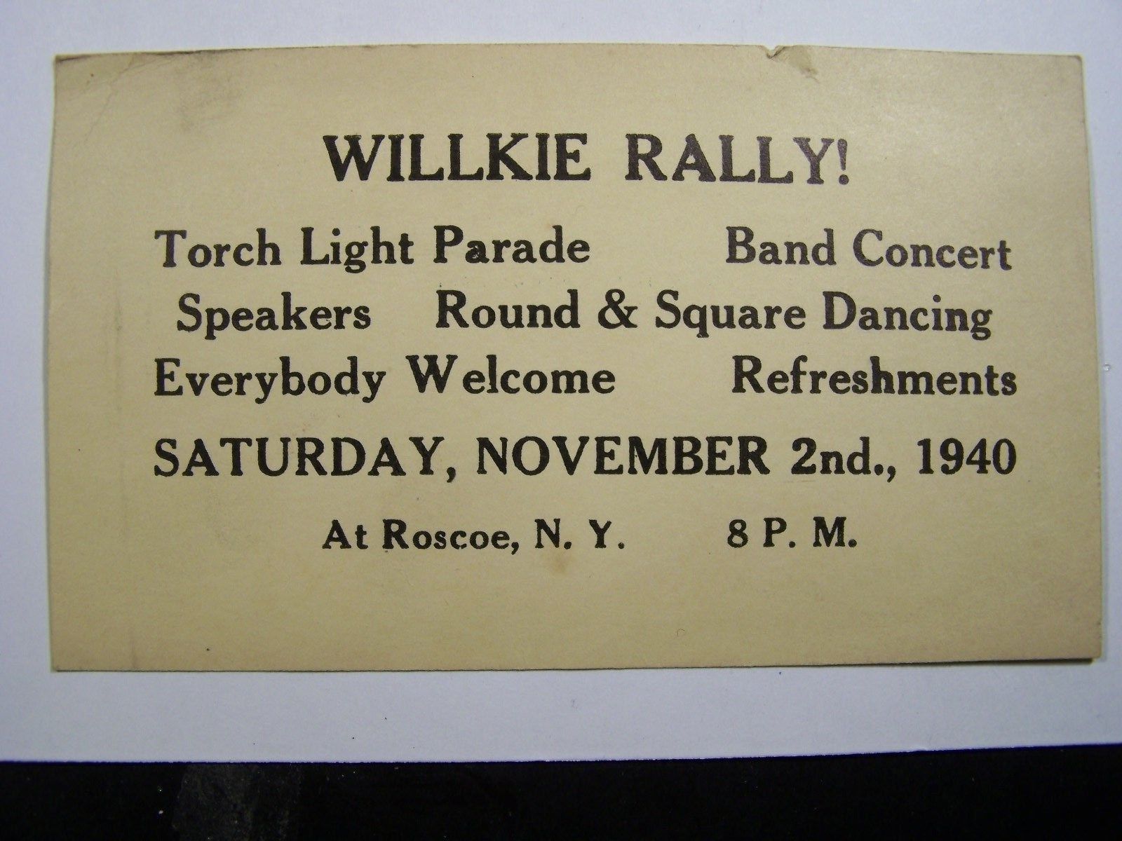 ROSCOE, NY-WILLKIE RALLY -1940 POST CARD REMINDER