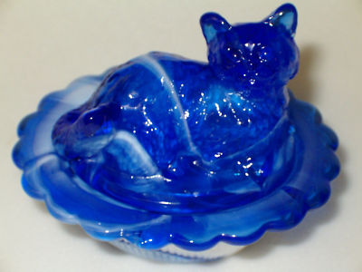 COBALT & MILK SLAG GLASS CAT KITTEN ON NEST BASKET SALT