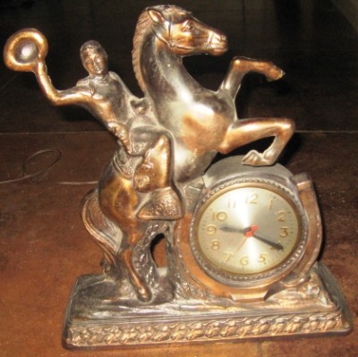 Title (ebay affiliate link): ANTIQUE CLOCK WITH HORSE AND RIDER!!! OLD WESTERN!!CAST