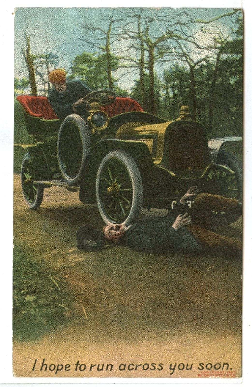 1 of 2 "I hope to run across you soon", Antique Car about to Run over a Gent...