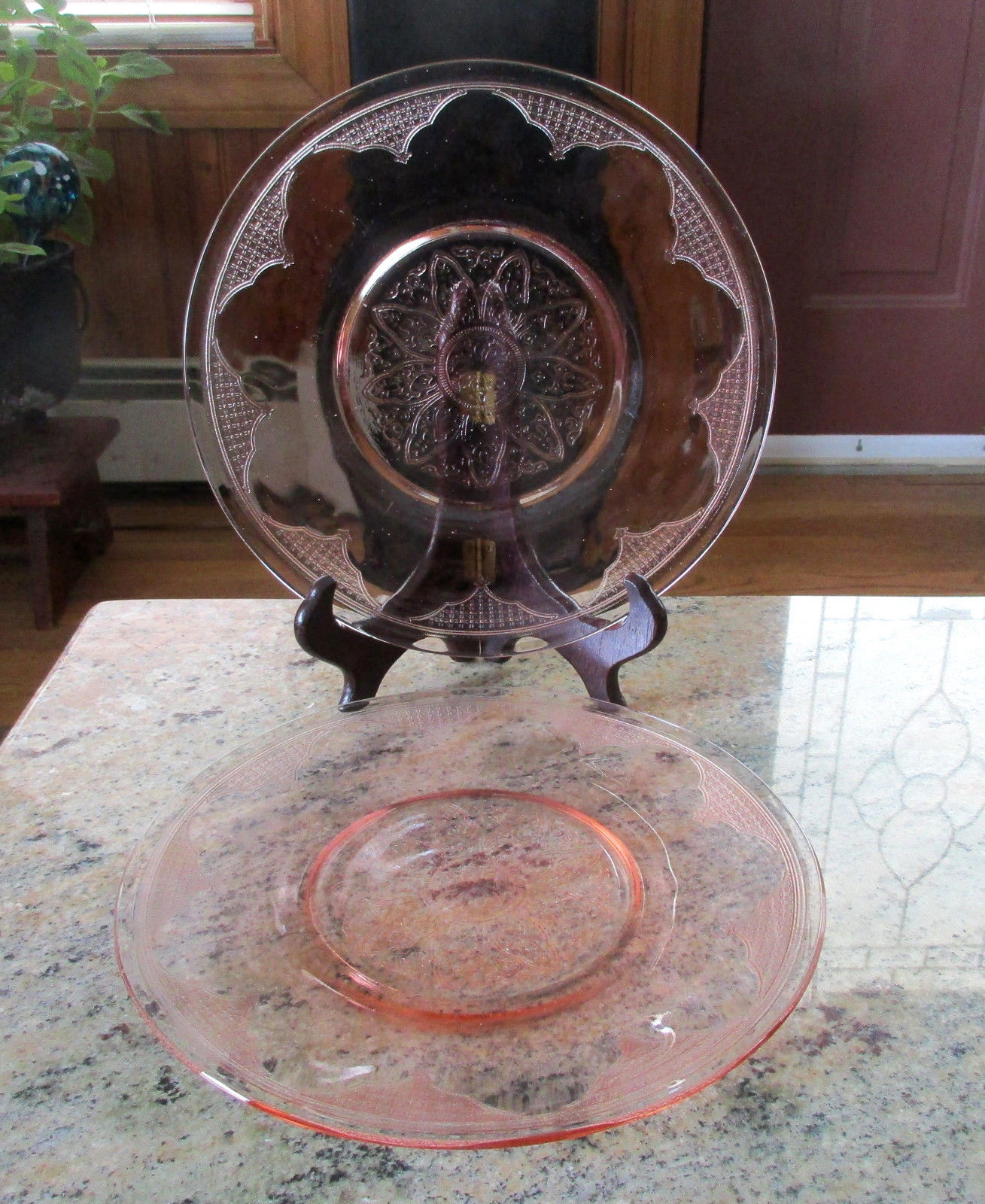 Title (ebay affiliate link): Two Vintage Pink Depression Glass Flower & Trellis Design 8 1/4" Plates
