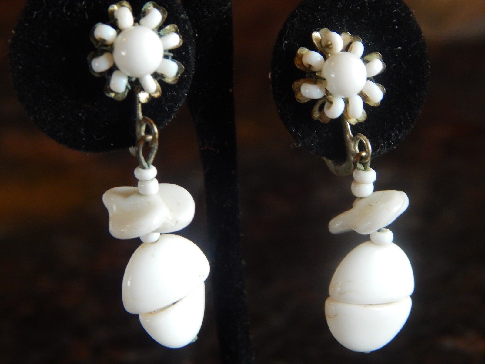 Title (ebay affiliate link): Vintage signed Miriam Haskell white milk glass dangle earrings