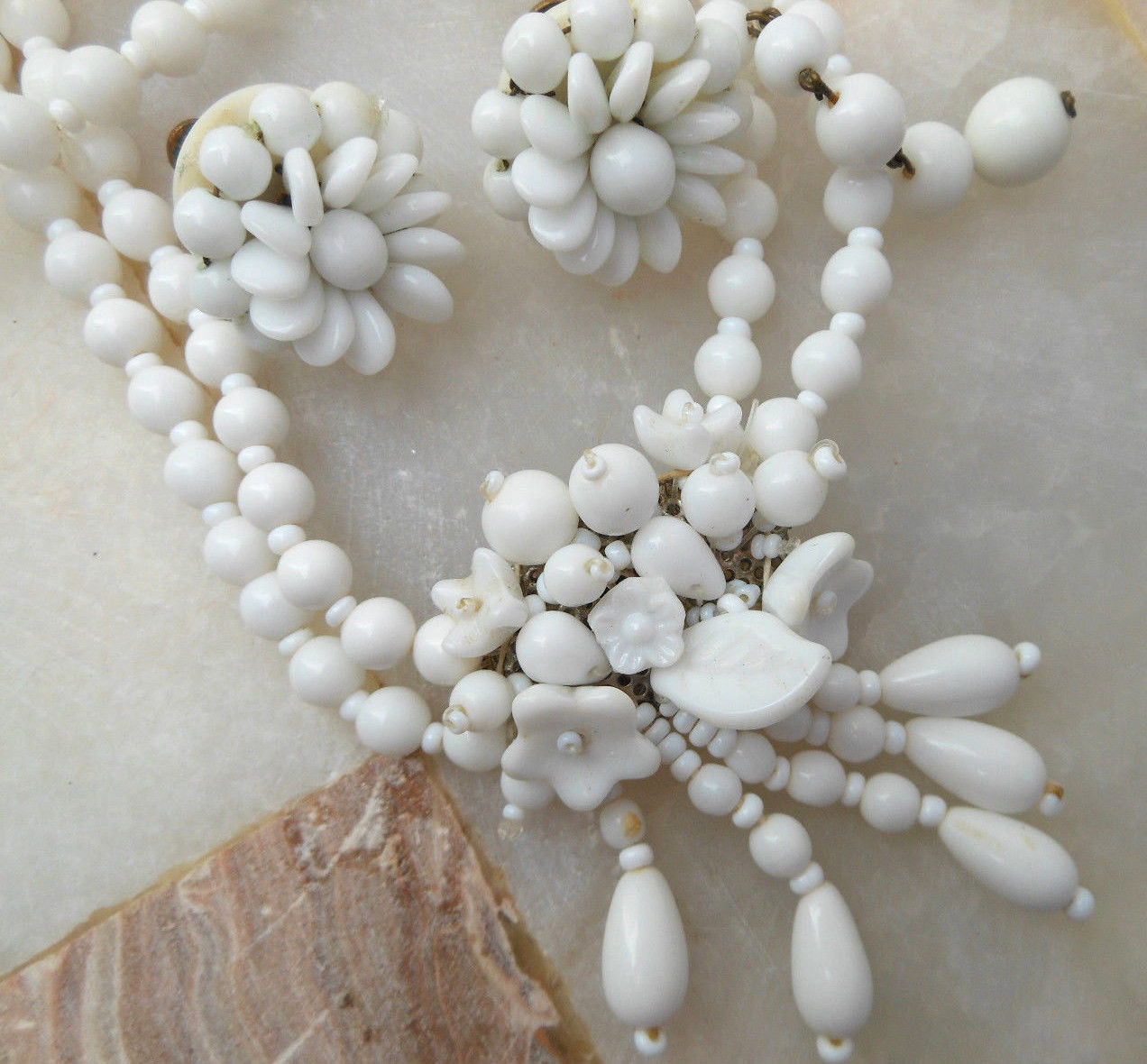 Vintage WEST GERMANY Necklace Earring SET White Milk Glass Bead Cluster Dangle