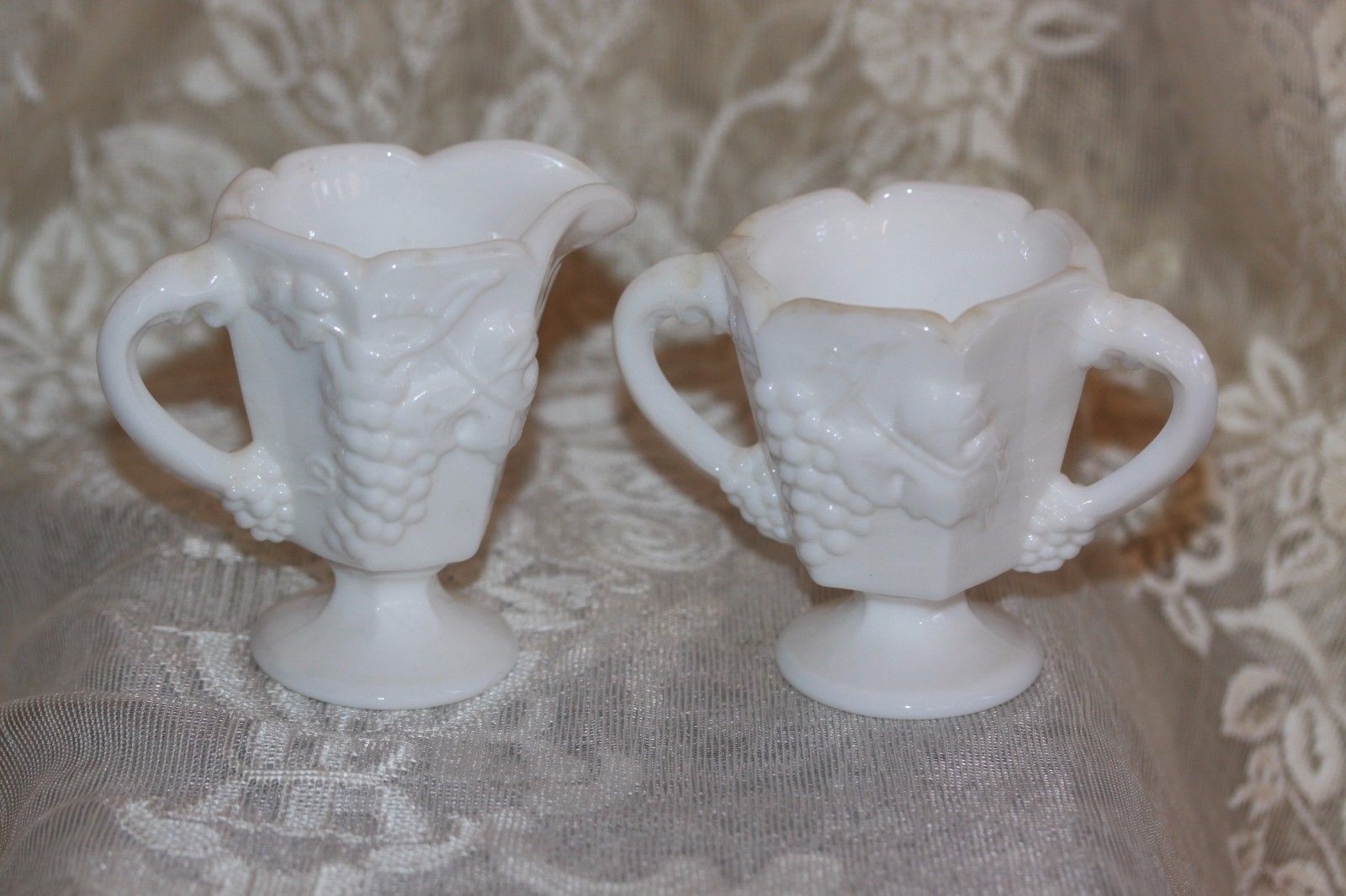 Title (ebay affiliate link): Vintage Childs Milk Glass Creamer and Sugar Grapes and Leaves Pattern