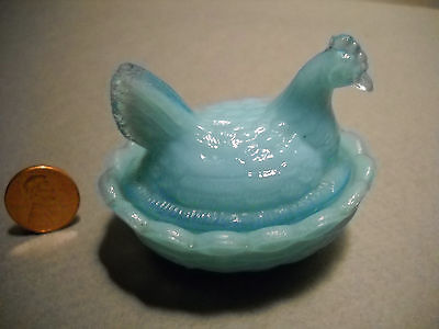 VINTAGE BLUE MILK GLASS HEN ON NEST SALT CELLAR- 2" TALL- SMALL CHIP ON LID